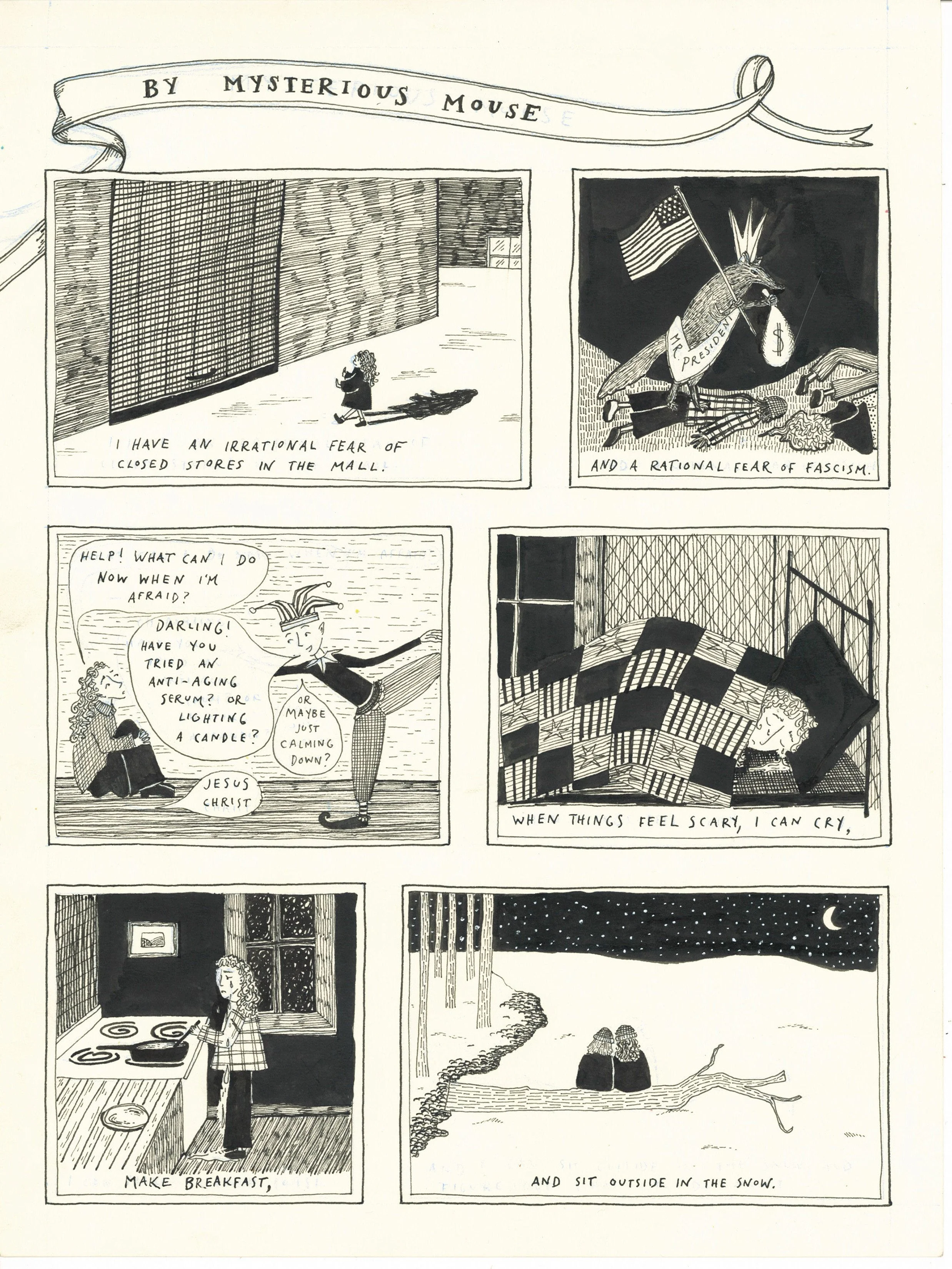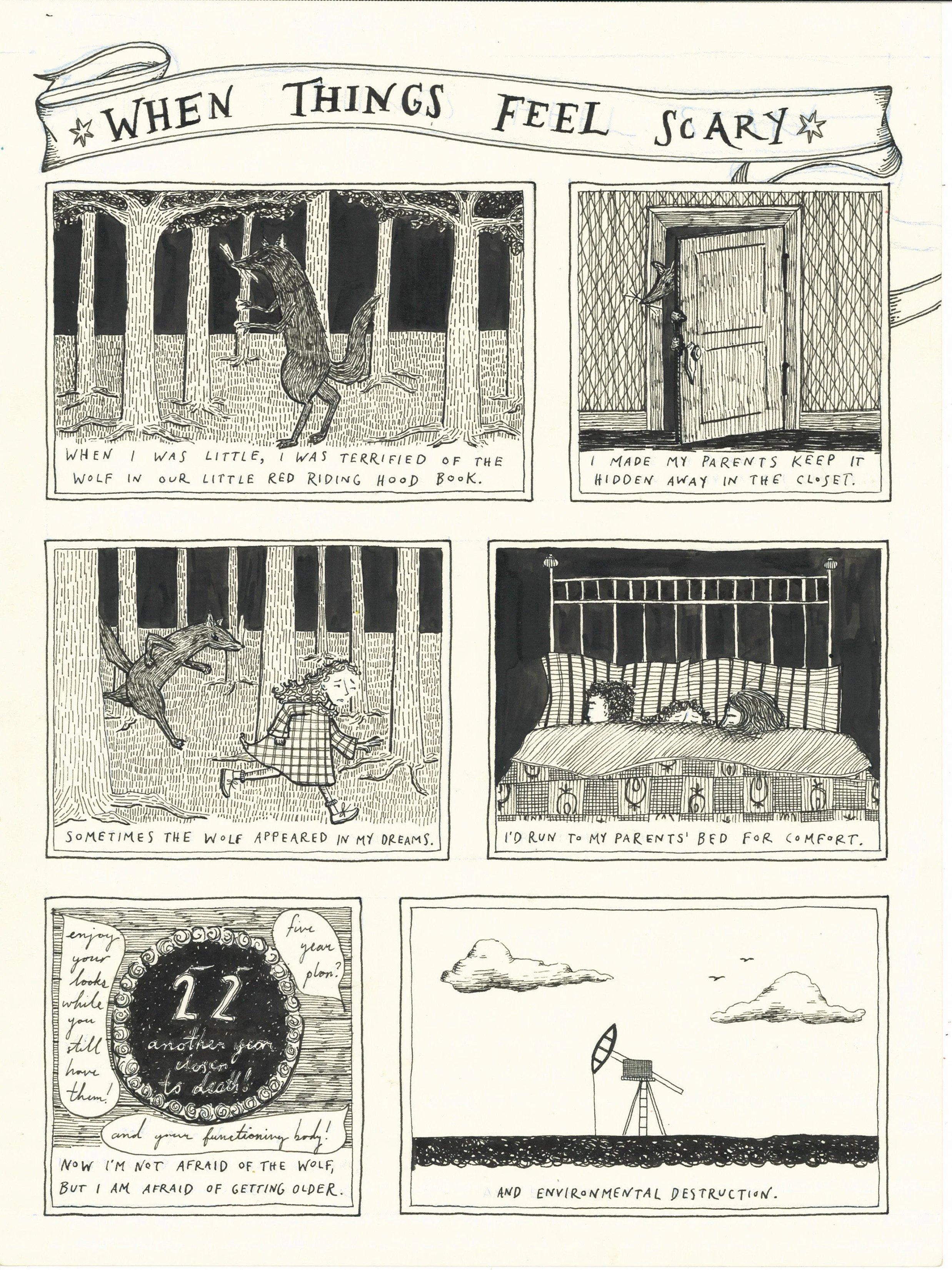 When Things Feel Scary, 2025, two 9 x 12" pages, pen and ink on paper