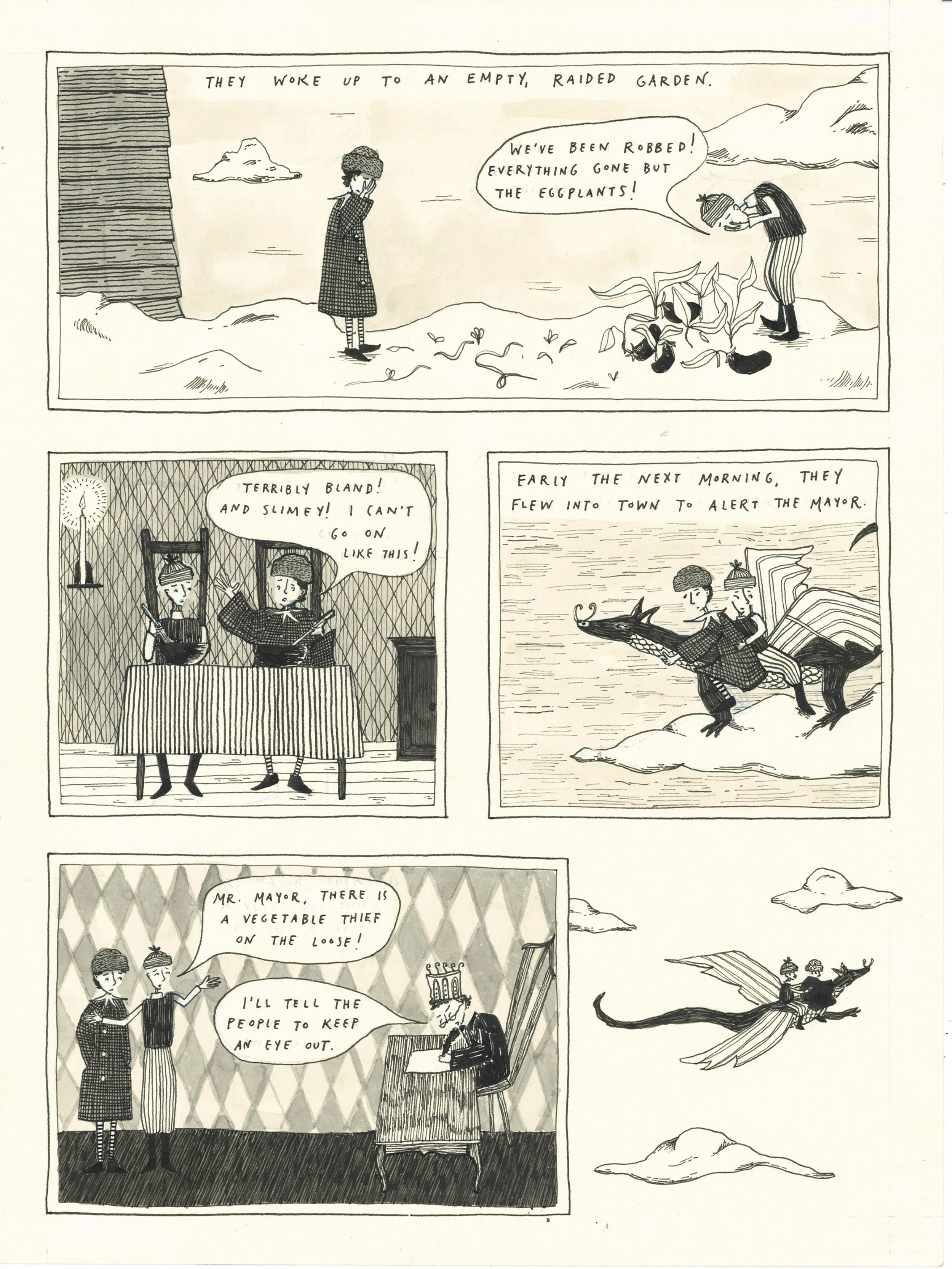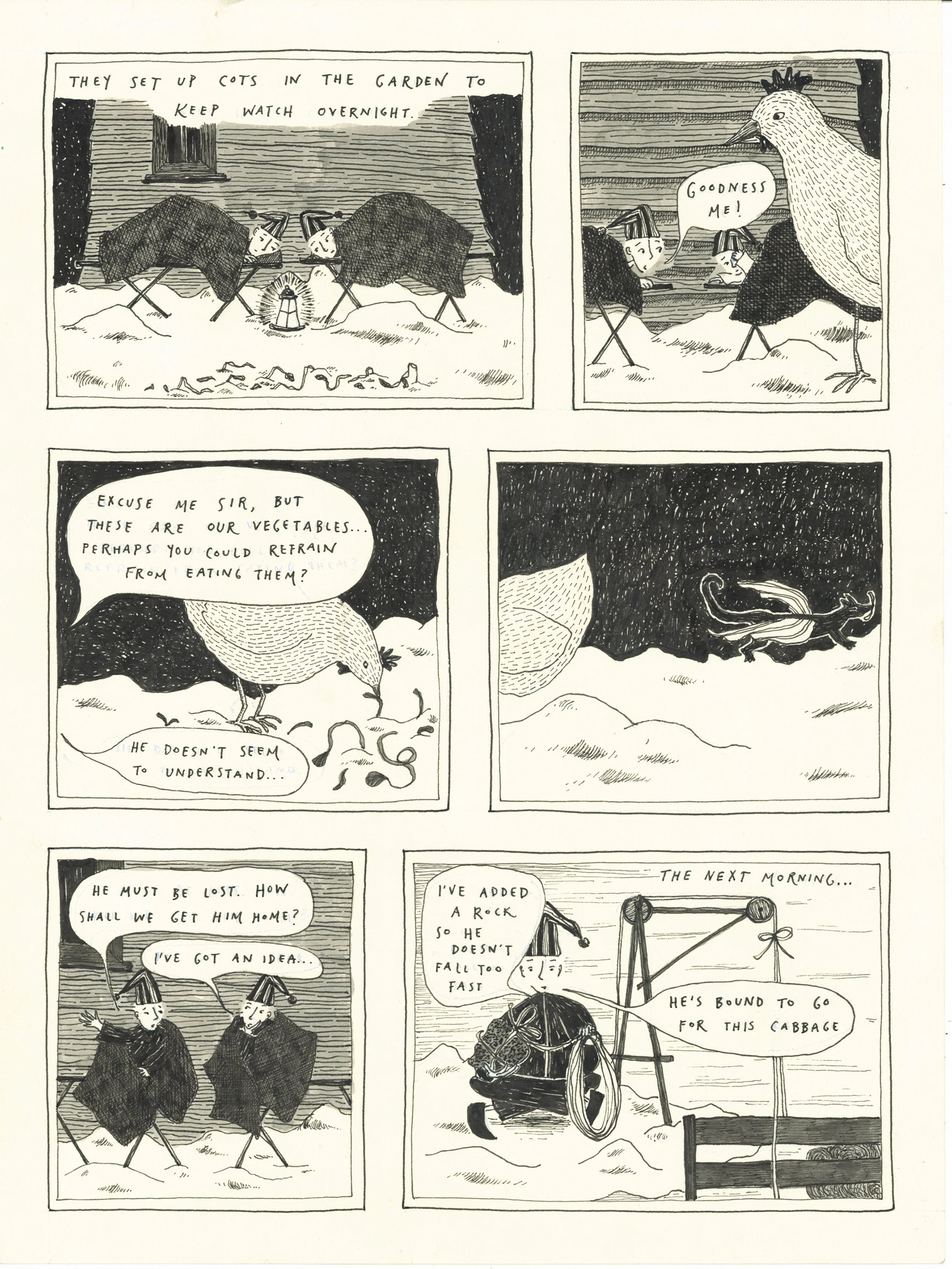 A Visitor From Below, 2025, four 9 x 12" pages, pen and ink on paper